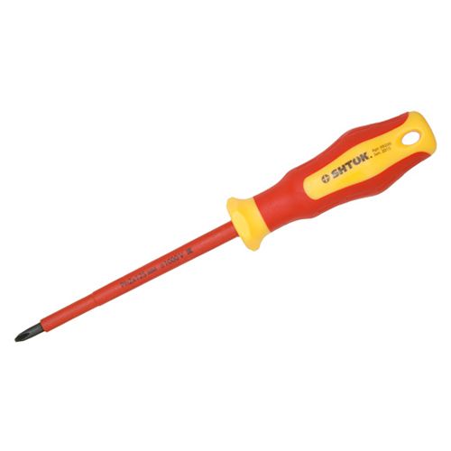 Диэлектрическая крестовая отвертка SHTOK 1000В Ph2x125 мм 09206 предназначена для работы с крепежом, имеющим профиль Phillips. Рабочая часть, выполненная из хром-ванадиевой стали, увеличивает прочность отвертки. Предусмотрен магнитный наконечник, обеспечивающий удобство монтажа в приборах, расположенных вертикально. Возможно использование отвертки для работ под напряжением.