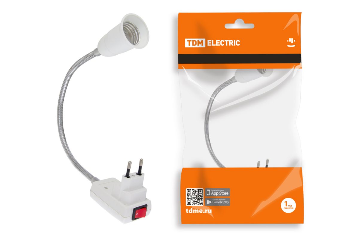 Переходник вилка-Е27 гибкий 300мм с выключателем, белый, TDM